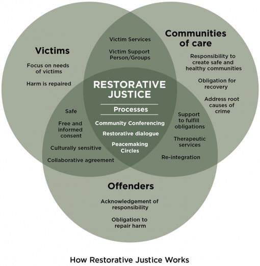 Cependant, à l’opposé de notre système habituel de justice punitive, il existe une conception tout à fait différente de la jurisprudence, fondée sur ce qu’on appelle la « justice réparatrice ». Dans la justice réparatrice, les victimes et les membres de la communauté sont invités à se réunir et à décider comment ils veulent traiter le criminel qui leur a causé un préjudice individuel et qui a ainsi nui à la société.
