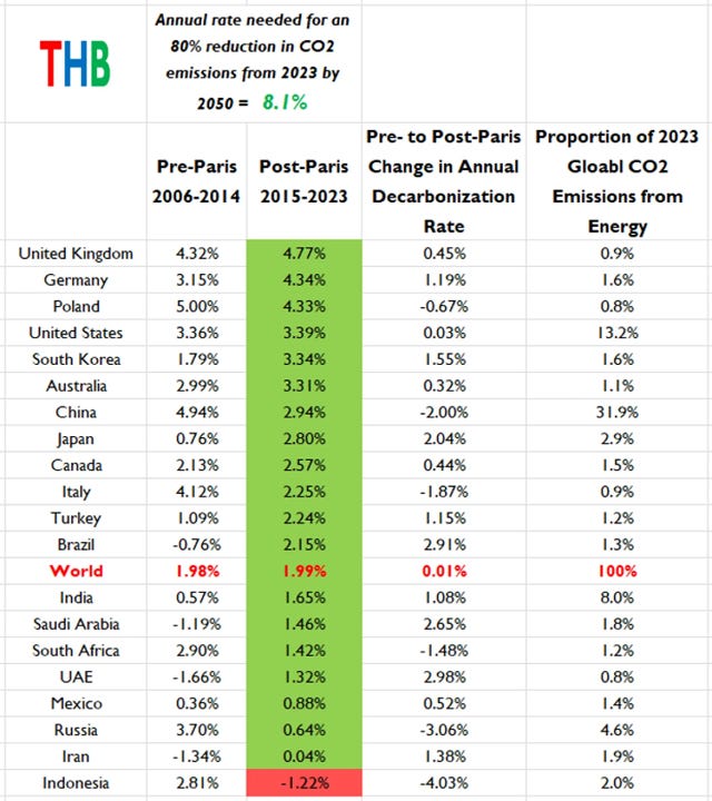 Le tableau ci-dessous examine les taux de décarbonation sous un autre angle : il compare les 8 années précédant l’accord de Paris aux 8 années qui ont suivi. Cette comparaison montre quels pays ont accéléré leur décarbonation après 2015. Comme vous pouvez le constater, il n’y a pas eu d’accélération de la décarbonation mondiale au cours des 8 années qui ont suivi l’accord de Paris.