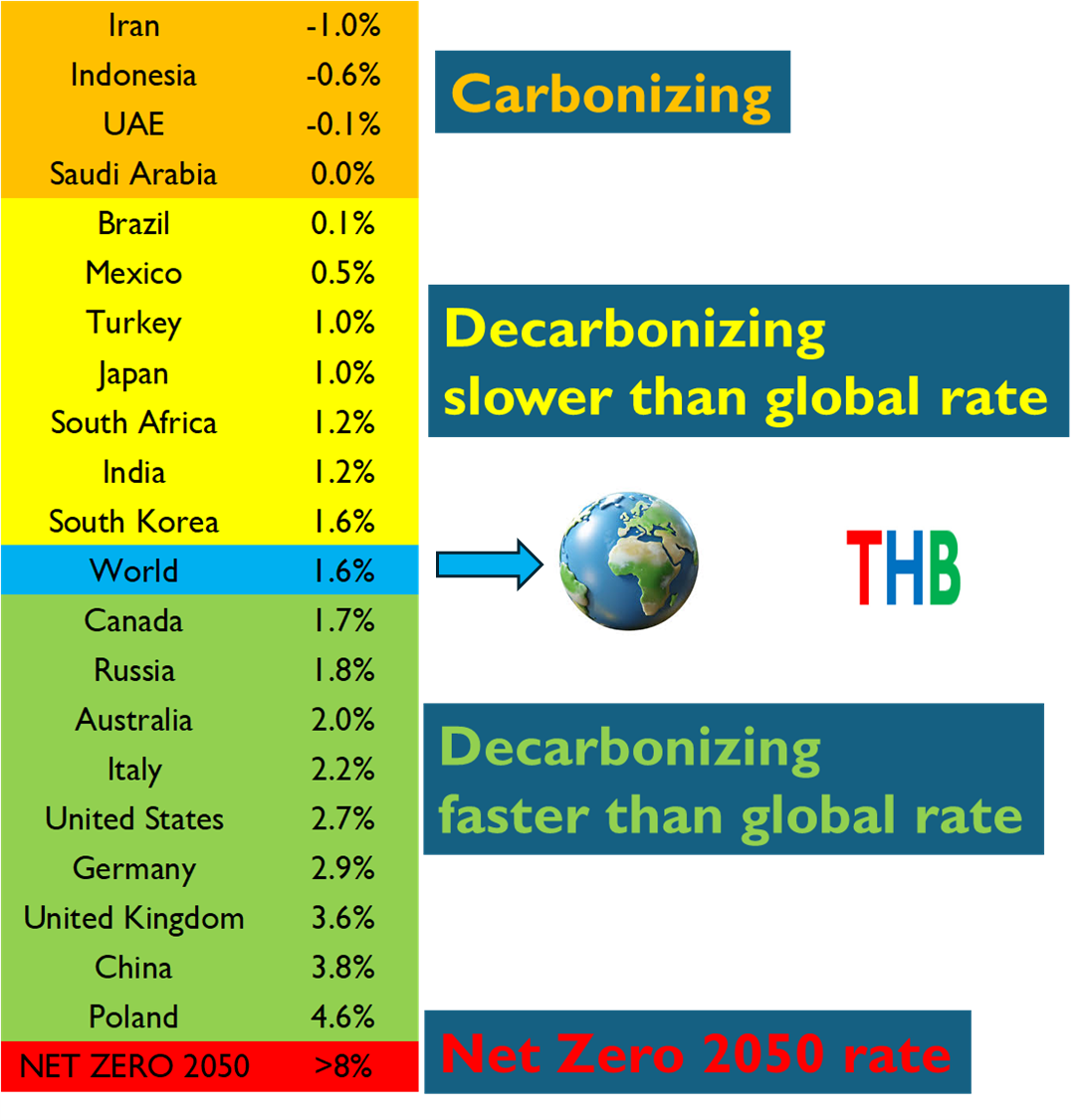 Vous pouvez constater qu’il existe de grandes variations dans la décarbonation globale par pays, allant d’une augmentation de 40 % (Iran) à une réduction de 80 % (Pologne) sur 35 ans. Ces différences reflètent des points de départ différents, des économies énergétiques différentes, des composantes différentes de la croissance économique, des politiques énergétiques nationales et internationales différentes, et bien d’autres facteurs encore.