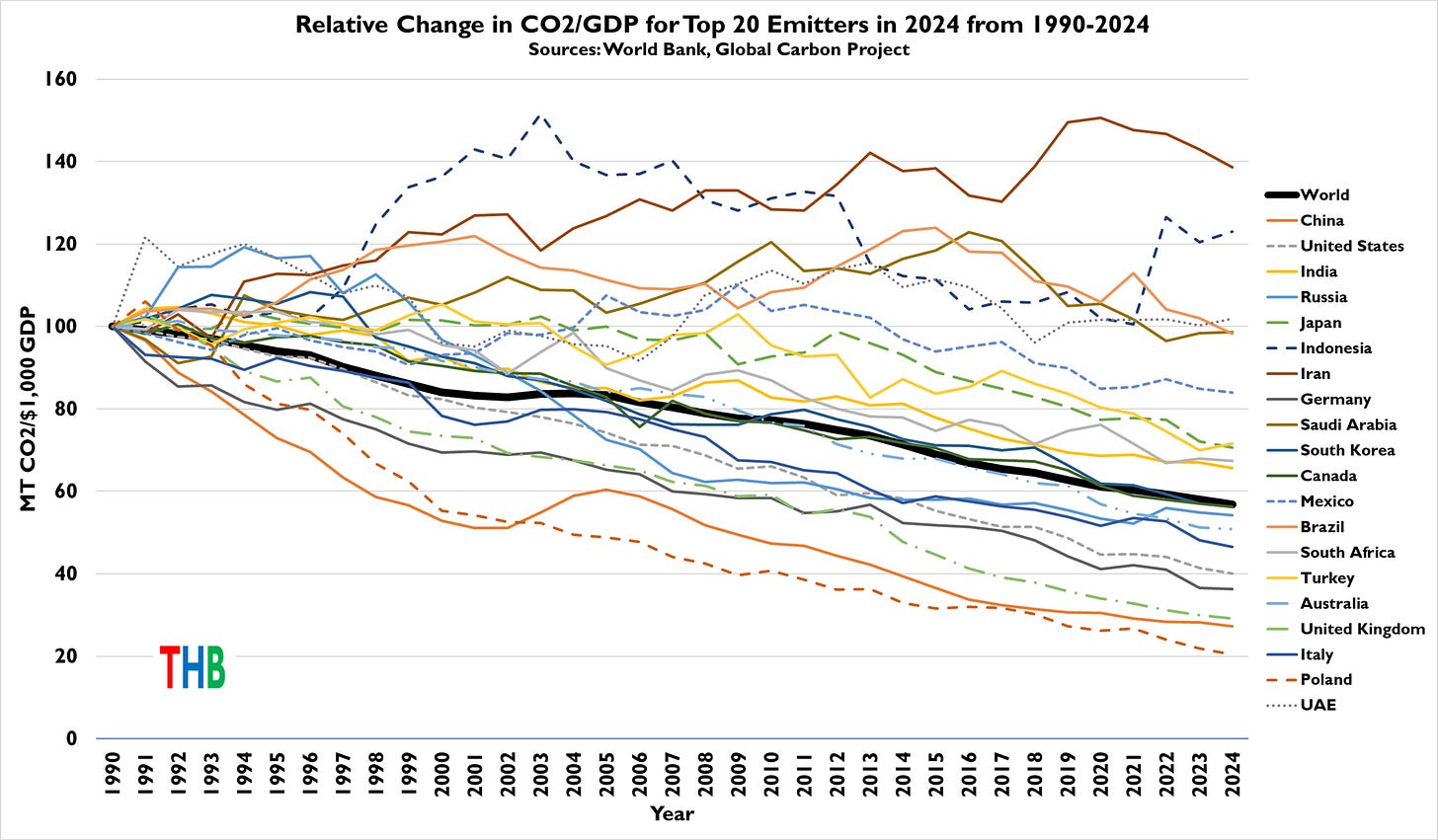 Le graphique ci-dessous montre la série chronologique de la décarbonation mondiale ainsi que les tendances en matière de décarbonation pour les 20 pays les plus émetteurs de dioxyde de carbone (en 2024), exprimées en variation relative par rapport à 1990 (fixée à 100 pour chaque pays).