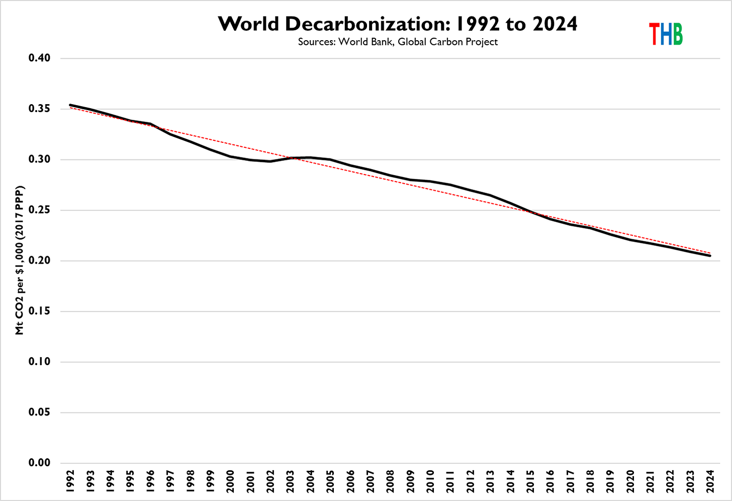 Le graphique ci-dessous montre la décarbonation de l’économie mondiale depuis 1992, année du Sommet de la Terre de Rio qui a vu l’adoption de la Convention-cadre des Nations unies sur les changements climatiques, jusqu’en 2024, dernière année pour laquelle des données sont disponibles.