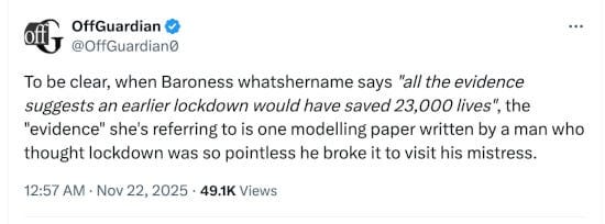 C’est bien sûr absurde. En fait, c’est pire qu’absurde : c’est un non-sens basé sur des chiffres inventés par un menteur notoire. Comme le souligne Off-Guardian dans son tweet (interdit ; shadow-banné) sur le sujet : Pour être clair, lorsque la baronne machin-chose dit que « toutes les preuves suggèrent qu’un confinement plus précoce aurait pu sauver 23 000 vies », les « preuves » auxquelles elle fait référence proviennent d’un article rédigé par un homme qui trouvait le confinement tellement inutile qu’il l’a enfreint pour rendre visite à sa maîtresse.