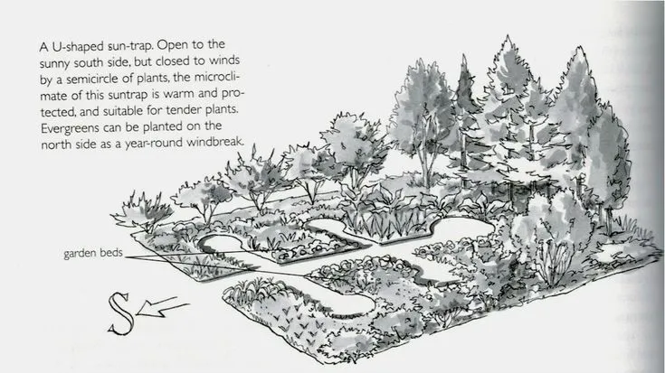 Des conifères peuvent être plantés au nord pour servir de brise-vent toute l’année.